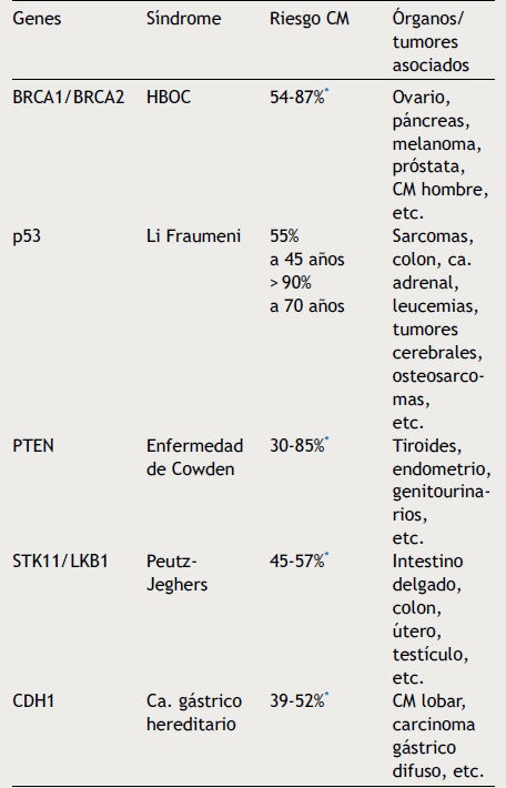 Un tercio de los casos de cáncer de mama presenta agregación familiar (CM familiar), con riesgos de aparición moderados o altos según el cuadro, y hasta el 10% de los casos de los cáncer de mama están asociados a la herencia de un gen mutado deficitario en su función (CM hereditario), alcanzando valores que pueden rondar hasta el 80% a lo largo de la vida, según el síndrome y el gen involucrados.