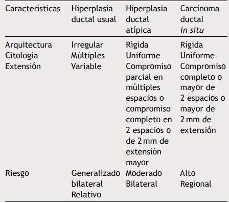 Las lesiones proliferativas intraductales de la mama usualmente se clasifican en tres categorías (tabla 4): hiperplasia ductal usual (HDU), hiperplasia ductal atípica (HDA) y carcinoma ductal in situ (CDIS).