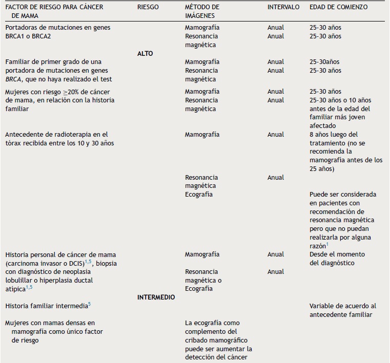 En mujeres con riesgo ≥ 20% de cáncer de mama en relación con la historia familiar, la edad de comienzo del cribado anual con resonancia magnética con contraste endovenoso y mamografía, es a los 25-30 años o 10 años antes de la edad del familiar más joven afectado, lo que sea primero. No se recomienda la realización de mamografía en mujeres menores de 25 años.