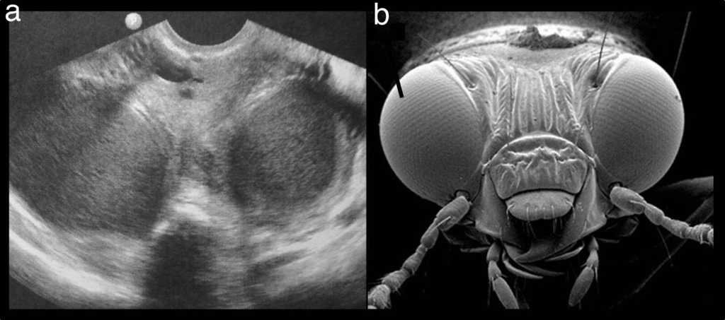 Esta ecografía endovaginal de una paciente con endometriomas bilaterales nos recuerda los ojos de una mosca vistos al microscopio (fig. 1).