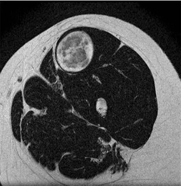 Resonancia magnética en ponderación T2 de muslo izquierdo en corte axial, muestra una lesión de bordes definidos con centro hipointenso y un halo hiperintenso (target sign).