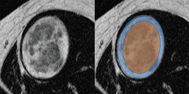 Los hallazgos están íntimamente relacionados con las características histológicas del tumor. El área central hipointensa corresponde a un tejido conectivo, mientras que el área hiperintensa periférica se debe al tejido mixoide.3 Esa descripción se vincula con la densidad celular: cuantas más células tenga la lesión, su aspecto será más hipointenso; mientras que a menor componente celular, la lesión se visualizará más hiperintensa.