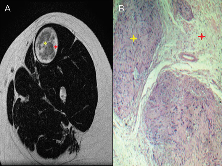 (A) target sign de un schwannoma en resonancia magnética y (B) su correlato anatomopatológico. El área central hipointensa corresponde a la zona celular Antoni A (estrella amarilla), mientras que la zona periférica hiperintensa corresponde a la zona celular Antoni B (estrella roja).