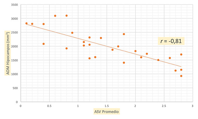 Correlación de Spearman del valor promedio de los análisis subjetivos visuales (ASV) de todos los evaluadores contra el análisis objetivo manual (AOM) promedio de ambos hipocampos.