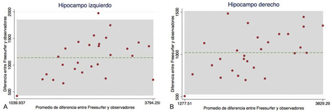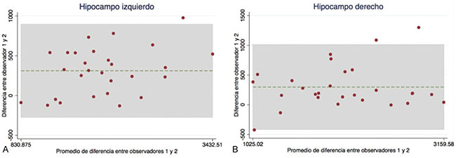 Gráficos de Bland-Altman representando los coeficientes de correlación intraclase entre operadores que realizaron el AOM de los hipocampos izquierdos (A) y derechos (B).
