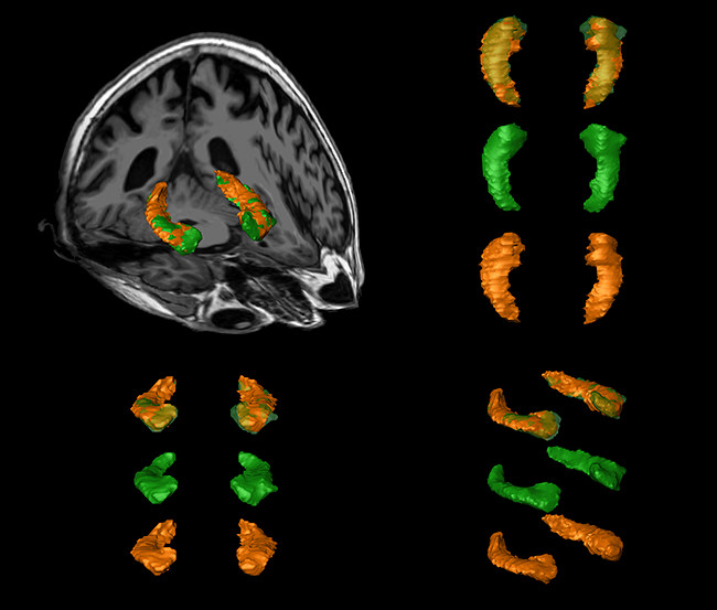 AOM de los hipocampos de un sujeto vs análisis objetivo automático (AOA). Se observan las reconstrucciones volumétricas de las segmentaciones manuales (en verde), automáticas (en naranja) y sus fusiones (en verde-naranja) de las formaciones hipocampales. En la esquina superior-izquierda, en una vista oblicua superpuestas a una secuencia volumétrica ponderada en T1, en la esquina superior-derecha en una vista superior, en la esquina inferior-izquierda en una vista anterior y en la esquina inferior-derecha en una vista oblicua.