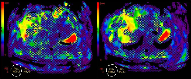 Una de las principales es la sobrecarga moderada a severa de hierro, ya que ella altera la relación señal/ruido (SNR) y puede generar errores en la medición, no dejando zonas medibles en la imagen de confianza.24 Es por ese motivo, que consideramos conveniente incluir la cuantificación de hierro en este protocolo. Cabe señalar que para esos casos disponemos de otras técnicas de adquisición de la ERM basadas en secuencias eco gradiente, que permiten contrarrestar al menos en parte ese efecto.