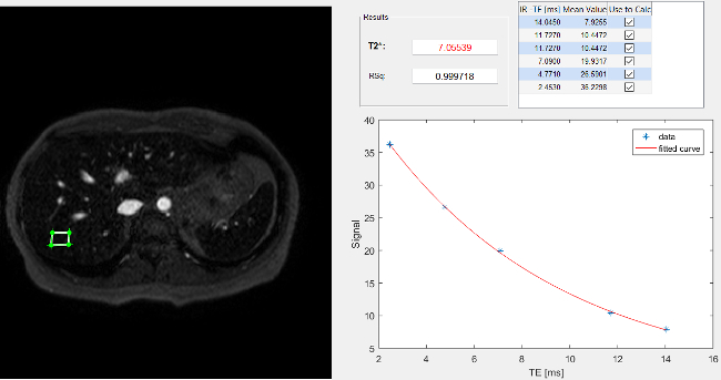 Paciente de 38 años con antecedentes de talasemia. La cuantificación de hierro en ese paciente arroja un valor T2* de 7.05, siendo la concentración hepática de hierro de 3.8mg/g, compatible con una sobrecarga leve. El gráfico de la izquierda muestra la caída progresiva de la señal en función del incremento del TE, lo que permite cuantificar el T2*, necesario para obtener el coeficiente de relaxometría y posteriormente la LIC.