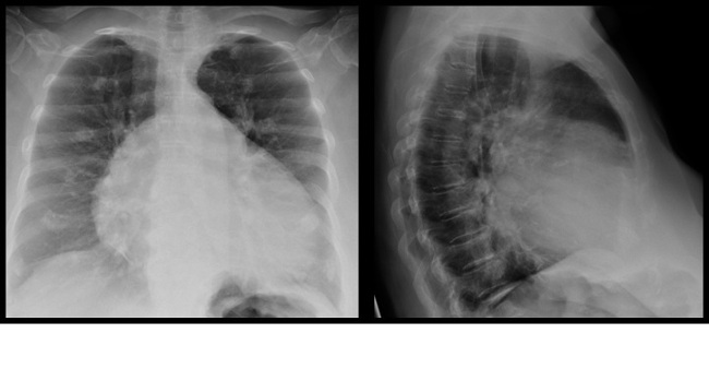 (A) Radiografía (Rx) póstero anterior de tórax, (B) Rx lateral de tórax. Se aprecia una cardiomegalia global, sin imágenes de condensación pulmonar ni derrame pleural.