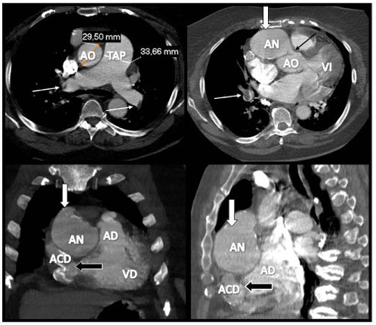 (A) Tomografía computada (TC) plano axial de tórax con contraste intravenoso (CIV) para estudio de arterias pulmonares, visualizándose signos de hipertensión pulmonar, con aumento del diámetro del tronco de la arteria pulmonar (TAP), y una relación TAP/Aorta (AO) >1. Signos de tromboembolismo pulmonar (TEP) agudo en arterias pulmonares (flechas blancas finas). (B) TC plano axial de tórax con CIV, cortes más caudales, apreciándose un aneurisma (AN) de la arteria coronaria derecha (ACD, flechas blancas gruesas) a 8 mm de su origen de la raíz aórtica (flecha negra fina), sin evidencia de trombosis. (C) TC plano coronal y (d) TC plano sagital, visualizándose en ambas proyecciones una dilatación aneurismática proximal de la ACD (flechas blancas gruesas) que producía una compresión extrínseca sobre el margen anterior de la aurícula derecha, asociada a ectasia y ateromatosis calcificada de la ACD (flechas negras gruesas). Abreviaciones: AD, aurícula derecha; AO, aorta; VD, ventrículo derecho; VI, ventrículo izquierdo.