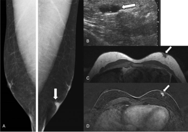 Tumor de células granulares. Varón de 30 años que refirió un bulto de nueva aparición en cuadrantes inferiores de mama izquierda.(A) Mamografía digital. Se observó un nódulo superficial, con engrosamiento de la piel en cuadrantes inferiores de mama izquierda (flecha). (B) Ecografía. Nódulo hipoecoico, ovalado (flecha). (C-D) RM (secuencia ponderada en T1 sin administrar contraste intravenoso y postcontraste) donde se observó que dicho nódulo presenta bordes mal definidos y una captación precoz de contraste (flechas). El resultado histológico tras la biopsia y la extirpación quirúrgica fue de tumor de células granulares.