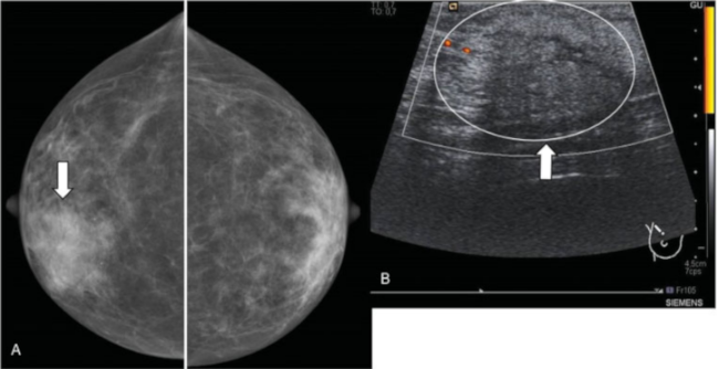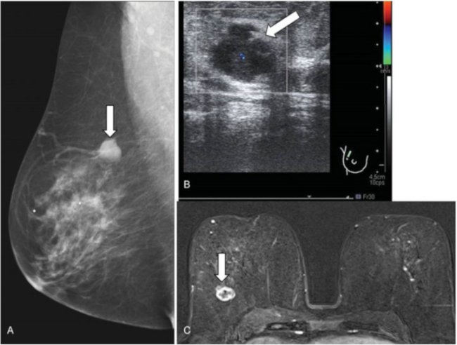 Suele presentarse como una masa firme, indolora, que puede causar retracción cutánea e inversión del pezón, siendo imposible establecer el diagnóstico definitivo sin biopsia (►Fig. 9). La mayoría son benignos, siendo malignos aproximadamente el 2%.
