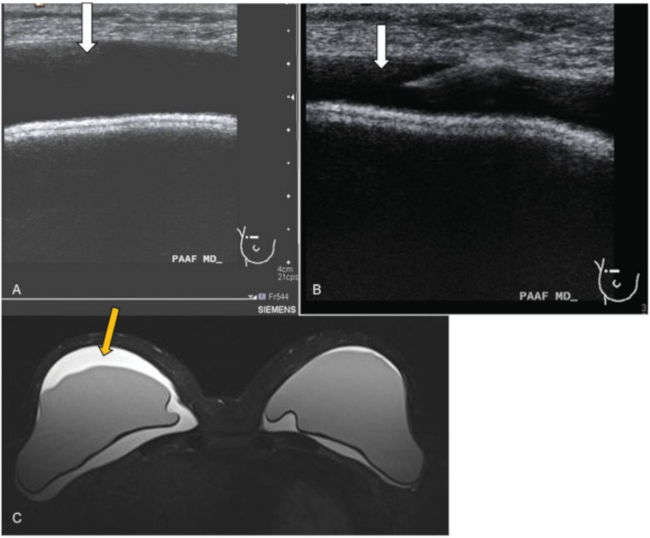 Linfoma anaplásico asociado a prótesis. Paciente mujer de 55 años con antecedente de mastectomía bilateral por carcinoma lobulillar in situ. Refirió molestias en ambas mamas, fundamentalmente en el lado derecho. (A) Ecografía. Líquido anecoico periprotésico de nueva aparición, de predominio en el lado derecho (flecha). (B) Se realizó punción aspiración con aguja fina (PAAF) con control ecográfico del líquido (flecha). (C) RM secuencia potenciada en T2 donde se identificó líquido periprotésico bilateral, de predominio en el lado derecho (flecha amarilla) e integridad de las prótesis en secuencias específicas (no incluidas). El resultado citológico de la punción fue de linfoma anaplásico de célula grande asociado a implante mamario.
