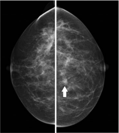 Cicatriz radial. Mujer de 48 años, asintomática. Mamografía digital. En cuadrantes internos de mama izquierda se identificó una lesión espiculada junto con distorsión parenquimatosa (flecha), criterios sospechosos de malignidad. Se realizó BAG y posteriormente extirpación quirúrgica, con resultado de cicatriz radial.