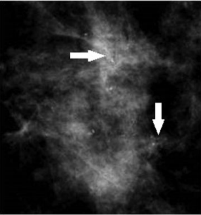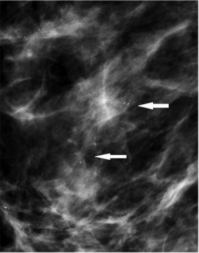 Atipia epitelial plana. Mujer de 51 años, asintomática. Mamografía digital magnificada. Cúmulo de microcalcificaciones amorfas (flechas), que aumentaron en número comparando con estudios previos. Se realizó BAV con guía esterotáxica, con resultado de atipia epitelial plana. Posteriormente se realizó biopsia quirúrgica tras colocación de arpón con resultado de atipia epitelial plana y papilomatosis múltiple intraductal.