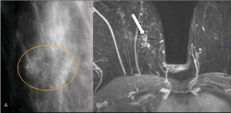 Hiperplasia ductal atípica y carcinoma intraductal. Mujer de 72 años, asintomática. Mamografía digital. (A) Cúmulo de microcalcificaciones amorfas y lineales finas (delimitadas por círculo amarillo). (B) RM tras introducir contraste intravenoso. Realce con distribución focal, en empedrado que coincidió con las microcalcificaciones descritas, criterios sospechosos de malignidad (flecha). Se realizó BAV con guía esterotáxica, con resultado de hiperplasia ductal atípica. Al realizar extirpación completa de las microcalcificaciones el resultado definitivo fue de carcinoma intraductal de alto grado.