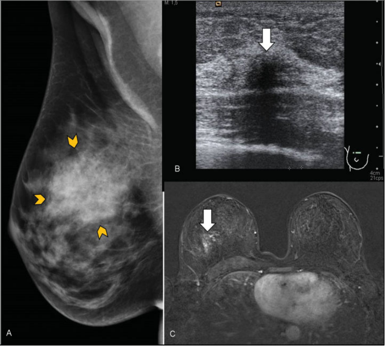 Neoplasia lobulillar in situ. Mujer de 48 años que acudió por masa palpable en mama derecha. (A) Mamografía digital mama derecha. Aumento de densidad de morfología nodular en cuadrantes superiores (delimitado por puntas de flechas amarillas). (B) Ecografía. Nódulo hipoecoico de morfología irregular y bordes mal delimitados (flecha). (C) RM con contraste intravenoso. Se apreció un realce asimétrico, no masa, con distribución focal (flecha). Se realizó BAG con control ecográfico con resultado de neoplasia lobulillar in situ. Al realizar cirugía de la lesión completa, se obtuvo el mismo resultado.