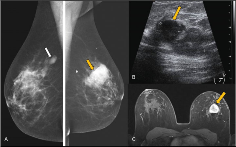 Tumor Phyllodes. Mujer de 45 años con antecedente de fibroadenoma en mama derecha que acudió por nódulo palpable de nueva aparición en mama izquierda. (A) Mamografía digital. Nódulos bilaterales, el de mayor tamaño en cuadrante superior externo (CSE) de mama izquierda (flecha amarilla). (B) Ecográficamente es un nódulo sólido, de bordes lobulados y ecogenicidad heterogénea (flecha), con zonas de buena transmisión del sonido. (c) RM con contraste iv. Nódulo hipervascular de bordes bien definidos (flecha). Tanto en la BAG como en la extirpación completa, el resultado histológico es de Tumor Phyllodes.
