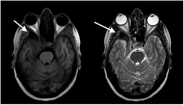 Resonancia magnética (RM) cerebral, secuencias ponderadas en T y T2, cortes axiales. Se aprecia un severo engrosamiento del ala mayor del esfenoides derecho, que mantiene una señal hipointensa homogénea (flechas blancas).