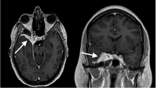 RM cerebral en secuencias ponderadas en 3DT1 tras la administración de contraste, cortes axial y coronal. Se observa un intenso realce homogéneo de la duramadre engrosada subyacente al esfenoides, sugestivo de meningioma en placa (flechas blancas). Esos hallazgos se acompañan de un tenue y focal aumento de señal en el espesor del hueso engrosado, e invaden las estructuras adyacentes, por lo que se extienden hacia el seno cavernoso y la silla turca.