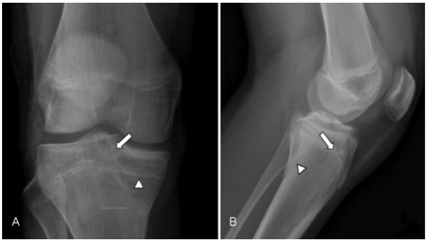Radiografía simple (Rx) de frente (A) de rodilla derecha con trazo de fractura vertical epifisario (flecha) y trazo horizontal fisario (punta de flecha). (B) Rx en proyección lateral donde se identifican trazos de fractura que afectan a la meseta tibial (flecha) y metáfisis de tibia proximal (punta de flecha).