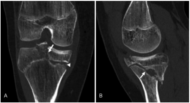 Tomografía Computada (TC) de rodilla, plano coronal (A) donde se observa un trazo de fractura vertical epifisario medial anterior (flecha) y un trazo horizontal fisario (punta de flecha). TC de rodilla plano sagital (B) con trazo oblicuo metafisario medial posterior (flecha).
