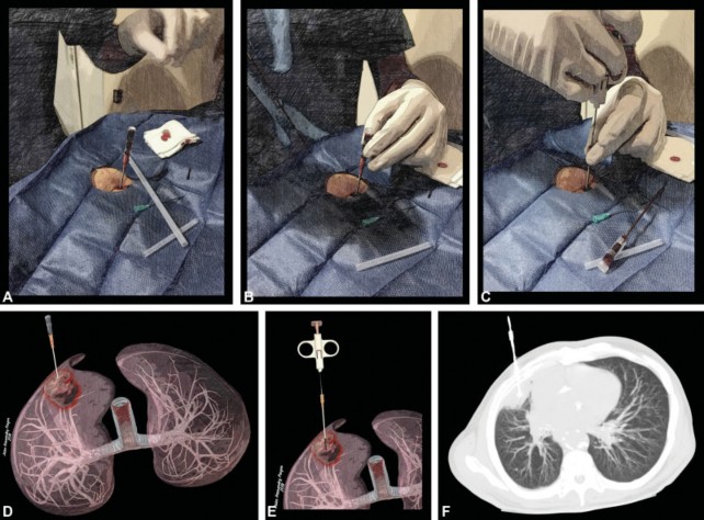 Posterior a la aplicación de anestesia local y una pequeña incisión en la piel con bisturí, se insertó un Abocath 18G con su trayecto apuntando hacia la lesión pulmonar a nivel de la zona con menor espesor hasta llegar a la lesión (A), se realizó control tomográfico y se avanzó el Abocath hasta una distancia de 3 mm previo a la pleura parietal, posteriormente cuando existe seguridad sobre la trayectoria y la distancia que existe hasta la lesión, avanzamos el Abocath rápidamente perforando la pleura y llegando hasta la lesión (d), luego retiramos el estilete del Abocath (B) por donde introducimos la pistola de 18G (C y E) y tomamos al menos dos muestras de tejido que son valoradas por el patólogo que se encontró presente durante el procedimiento. Finalmente realizamos un nuevo control tomográfico en busca de complicaciones (F).