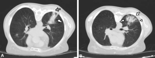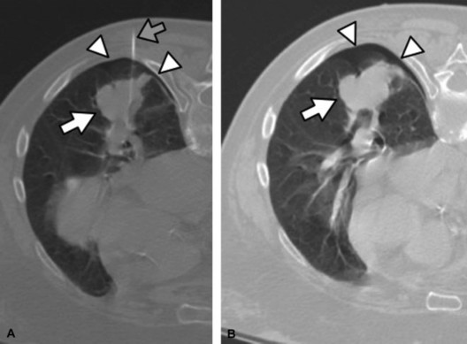 Paciente con masa pulmonar (flecha blanca en A y B), sometido a PPT-TC, en plano axial. Se observó imagen laminar con densidad aérea en espacio pleural paralela a la pared torácica compatible con mínimo neumotórax (punta de flechas), nótese la aguja gruesa (flecha gris) atravesando la pared torácica y con extremo distal en la masa. TC plano axial (B) realizada 10 minutos después donde se observa incremento del contenido aéreo en el espacio pleural, hallazgo compatible con neumotórax leve.
