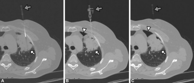 Paciente con masa pulmonar en segmento anterior de lóbulo superior izquierdo (flecha blanca), en (A) TC plano axial, Abocath 18 (flecha gris). (B) TC plano axial realizada dos minutos posterior a la inserción del Abocath, se observó leve cantidad de contenido aéreo en el espacio pleural (punta de flecha blanca), dispositivo Trucut (flecha gris); (C) TC plano axial donde se evidencia aumento en la cantidad aérea contenida en la cavidad pleural, indicando neumotórax moderado.