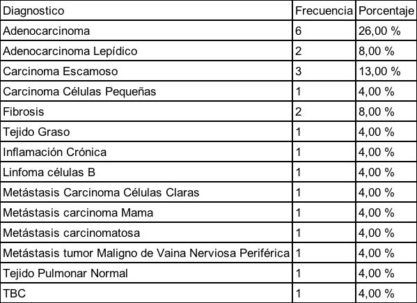 Dentro de los criterios de inclusión, se tomaron en cuenta pacientes con nódulo, masa o consolidación pulmonar, pruebas de coagulación dentro de los parámetros normales realizadas no más allá de 4 días previo a la biopsia y pacientes que tolerasen decúbito supino o decúbito prono.