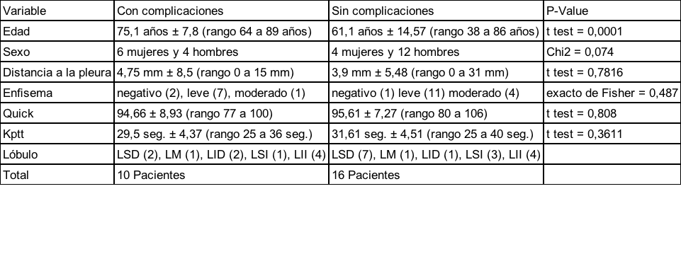 Resultados Se realizaron 26 punciones, la tasa de incidencia de complicaciones fue del 38,46% en 1 año; los pacientes presentaron: neumotórax leve (n = 7), neumotórax moderado (n = 3) y hemorragia alveolar difusa (n = 1). El análisis estadístico univariado mostró una diferencia estadísticamente significativa en la edad de los pacientes que presentaron complicaciones v/s los pacientes que no presentaron complicaciones (61,18 þ/- 3,6 versus 75,1 þ/- 2,46 años, p = 0,0107).