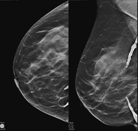 Mamografía digital sintetizada. Incidencias en craneocaudal (CC) y mediolateral oblicua (MLO) de mama derecha se evidencian calcificaciones gruesas lineales discontinuas en el plano posterior de los cuadrantes internos.