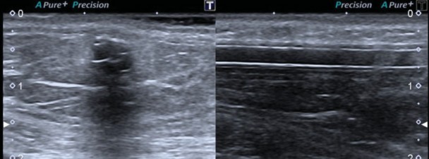 Ecografía focalizada de los cuadrantes internos de la mama derecha, donde se visualiza una imagen de aspecto tubular.
