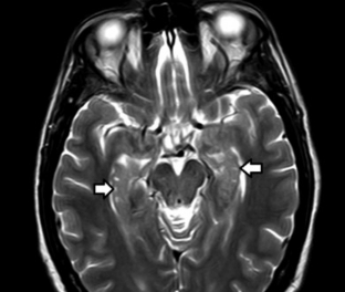 RM de cerebro, corte axial ponderado en T2; se muestran milimétricas imágenes de apariencia quística en las circunvoluciones hipocampales (flechas). Las mismas son remanentes del surco hipocampal.