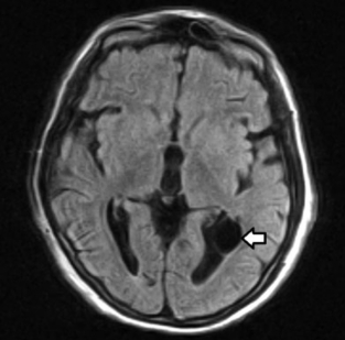 RM de cerebro, corte axial FLAIR; se aprecia en la prolongación occipital del ventrículo lateral izquierdo una imagen de apariencia quística de pared delgada (flecha) compatible con quiste ependimario.