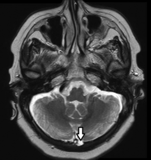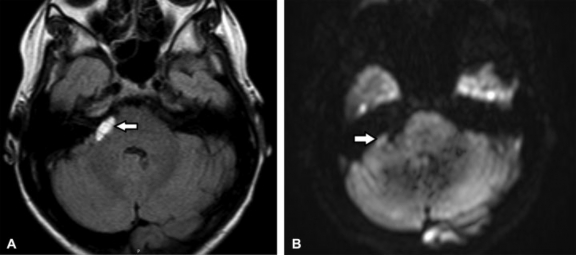 (A-B) RM de cerebro, cortes axiales en impresión a una secuencia FLAIR (A) y DWI (B). Se pone de manifiesto en el ángulo pontocerebeloso derecho una lesión espontáneamente hipertintensa en ponderación T1 que presenta restricción parcial en la secuencia DWI (flechas). La imagen es compatible con "quiste epidermoide blanco."