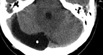TC de cerebro en la que se señala la presencia de un quiste aracnoideo de la fosa posterior con prolongación parasagital derecha (*).