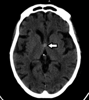 TC de cerebro se evidencia una imagen redondeada, hiperdensa, alojada en el III ventrículo (flecha). Corresponde a un quiste coloide.
