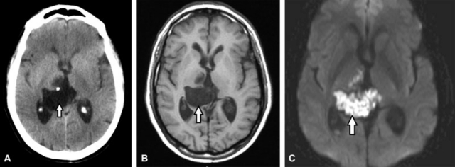 (A-C) Se aprecian en los cortes axial de TC (A), axiales ponderados enT1 (B) y DWI (C) de RM de cerebro, la presencia de una lesión quística localizada a nivel del III ventrículo de ubicación parasagital derecha. En TC es isodensa con el LCR, mientras que en RM se aprecia hipointensa en ponderación T1 con marcada restricción en DWI; comportamiento imagenológico característico de un quiste epidermoide (flechas).
