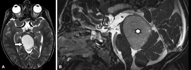 Son lesiones quísticas benignas que derivan del remanente de la bolsa de Rathke.4,22 Localizados en la línea media entre los lóbulos anterior y posterior de la adenohipófisis. Puede presentar extensión supraselar en el 60% de los casos.4,22 En TC se aprecia una lesión intraselar en la pars intermedia o próxima a ella, de apariencia quística (hipodensa) que no realza tras la administración de contraste ni presenta calcificaciones.23 En RM tienen señal variable (hipo/hiperintensos) en ponderación T1 e hiperintensos en ponderación T2, debido a su alto contenido de proteínas y colesterol (►Fig. 18).22,23 Es característica la presencia de nódulos intraquísticos, hipointensos en todas las secuencias, sin realzar con gadolinio.4,23 Los quistes de la bolsa de Rathke suelen no presentar sangrado, por lo que una imagen quística con derivados hemáticos corresponderá a un adenoma hipofisario.22 Los diagnósticos diferenciales deben realizarse con4,23: