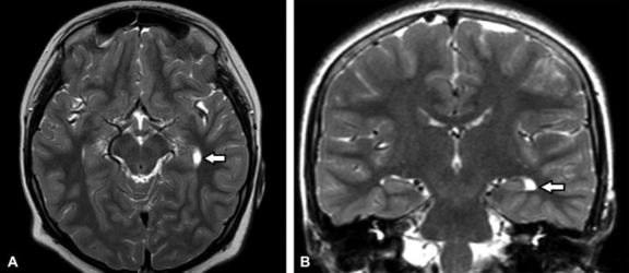 (A-B) RM de cerebro. Cortes axial en ponderación T2 (A) y coronal en ponderación T2 (B). Se aprecia elongación de la cisura (fisura) coroidea izquierda por una imagen quística (flechas). Corresponde a un quiste de la cisura (fisura) coroidea.