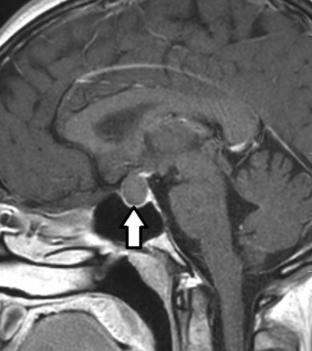 Quiste de Rathke. RM de hipófisis. Cortes: sagital en ponderación T1 con gadolinio. Se aprecia una imagen de apariencia quística en la adenohipófisis (flecha), sin realzar con gadolinio. La misma se extiende cefalicamente hasta contactar con el quiasma óptico.