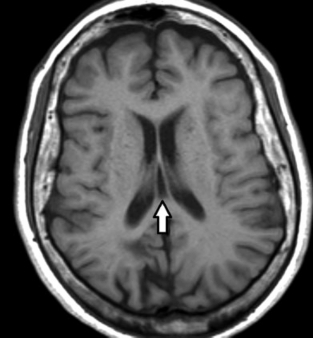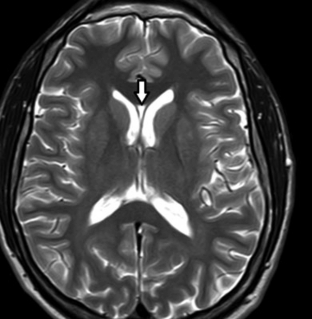 Resonancia magnética (RM) de cerebro, corte axial ponderado en T2: la flecha señala al cavum septum pellucidum (CSP) entre las astas frontales de los ventrículos laterales.