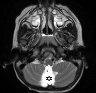 RM de cerebro. Corte axial en T2. Se observa ensanchamiento de la fosa posterior caracterizada por la presencia de un quiste en contacto con el IV ventrículo asociado a hipoplasia del vermis cerebeloso (*). Corresponde a malformación de Dandy Walker.