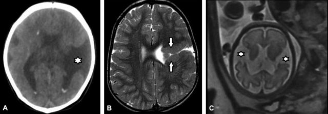 (A-C) TC de cerebro, corte axial (A) en el que se observa esquisencefalia a labio abierto temporal izquierda (*). RM de cerebro, corte axial en ponderación T2 (B). Se pone de manifiesto esquisencefalia a labio cerrado fronto-temporal izquierda; nótese polimicrogiria en sus labios (flechas). La RM fetal, corte axial en ponderación T2 de cerebro (C) muestra esquisencefalia a labio abierto bilateral (*).