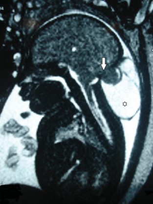 RM fetal. Corte sagital en ponderación T2. En la región occipital se aprecia un defecto óseo (flecha) que contiene tejido encefálico occipital, meninges y LCR, adoptando la apariencia de un voluminoso quiste (*). Se trata de un meningoencefalocele occipital.