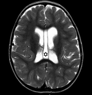 RM de cerebro corte axial ponderada en T2: se evidencia una cavidad interpuesta entre los ventrículos laterales (asterisco). Corresponde a cavum vergae (CV) asociado a CSP.