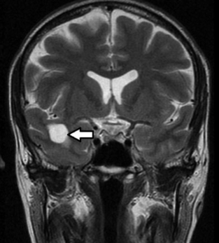 RM de cerebro, corte coronal ponderado en T2. En el lóbulo temporal derecho se observa una imagen quística simple (flecha). Corresponde a un quiste neuroglial.
