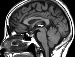 RM de cerebro, corte sagital ponderado en T1. La anatomía normal de la glándula pineal se encuentra modificada por la presencia de una imagen de apariencia quística simple (flecha).