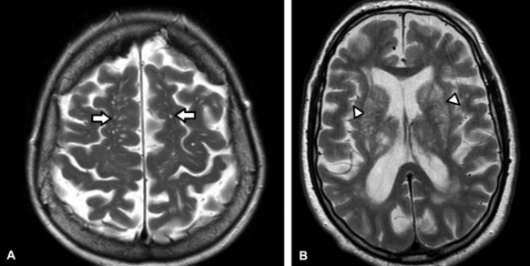 (A-B) RM de cerebro, cortes axiales ponderados en T2. Se objetivan múltiples cavidades milimétricas en los centros semiovales (flechas). Corresponden a dilatación de espacios perivasculares de Virchow-Robin. El etát criblé es consecuencia de la marcada dilatación de numerosos espacios perivasculares en los núcleos grises (cabezas de flecha en b).